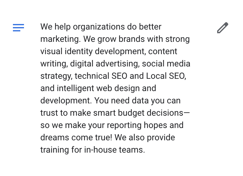 This could depend on the content you have on the page linked to from your location’s Google Business Profile or the information included directly on your business profile.