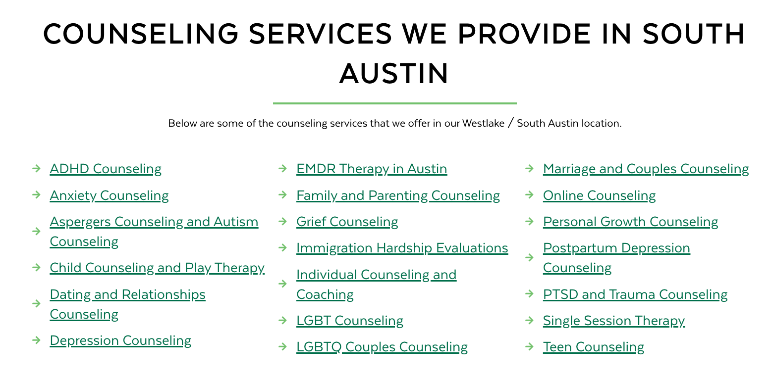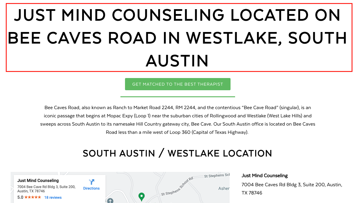 For example, the old H1 header tag was just “South Austin — Westlake Location.” We recommended the H1 header tag to be “Just Mind Counseling Located On Bee Caves Road In Westlake, South Austin” (see screenshot above).