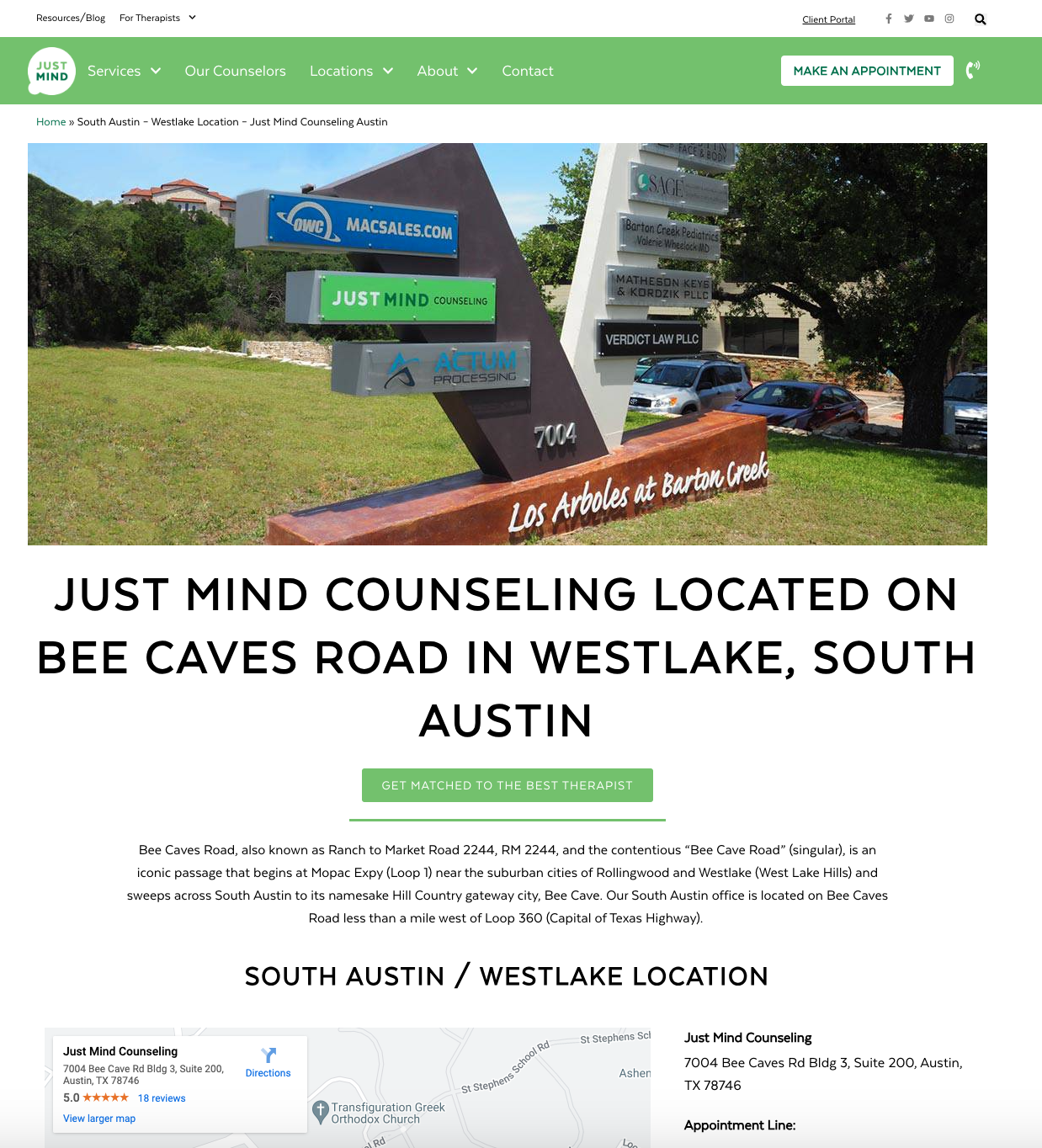 For example, the new title tag for the Westlake location (see screenshot above) would be “Just Mind Counseling South Austin, Westlake | 7004 Bee Caves Rd Bldg 3, Suite 200, Austin, TX 78746.”
