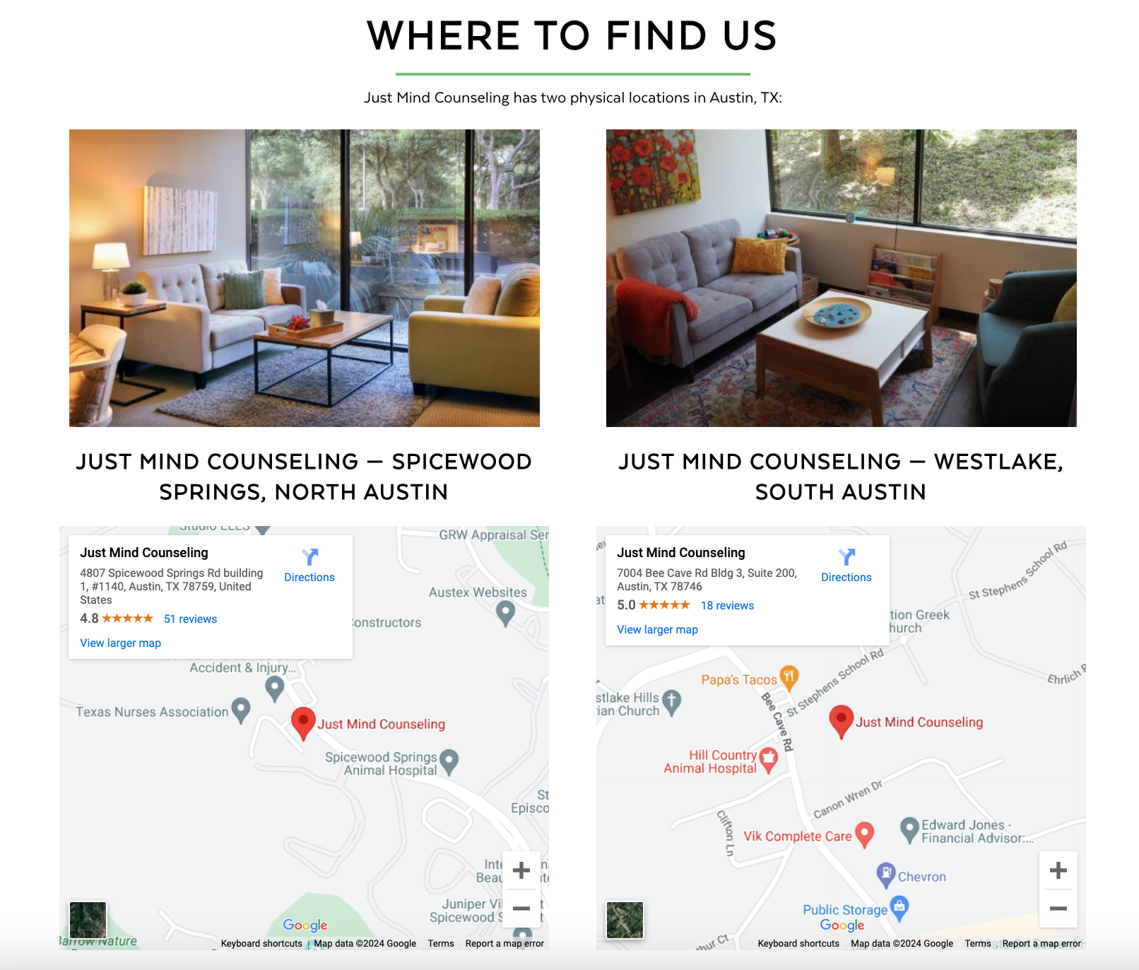 These two locations are located 9.2 miles apart (or about a 20 minute drive) and when Googling the brand “Just Mind” or “Just Mind Counseling” — without being directly next to, or too close to a single location — a user would only ever see the North Austin, Spicewood Springs location.