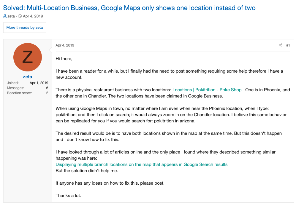 We recently worked with a multi-location business who experienced the same problem the forum user (Zeta) outlined in the above screenshot. The comments and advice included: